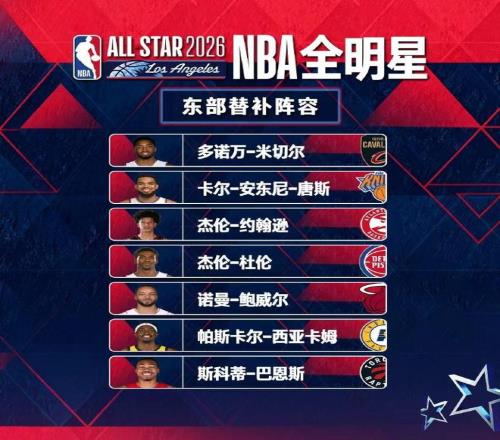 东部替补是米切尔(骑士)、杰伦·约翰逊(老鹰)、唐斯(尼克斯)、西亚卡姆(步行者)、鲍威尔(热火)、巴恩斯(猛龙)、杜伦(活塞)。首发是布伦森(尼克斯)、字母哥(雄鹿)、马克西(76人)、坎宁安(活塞)、杰伦·布朗(凯尔特人)。